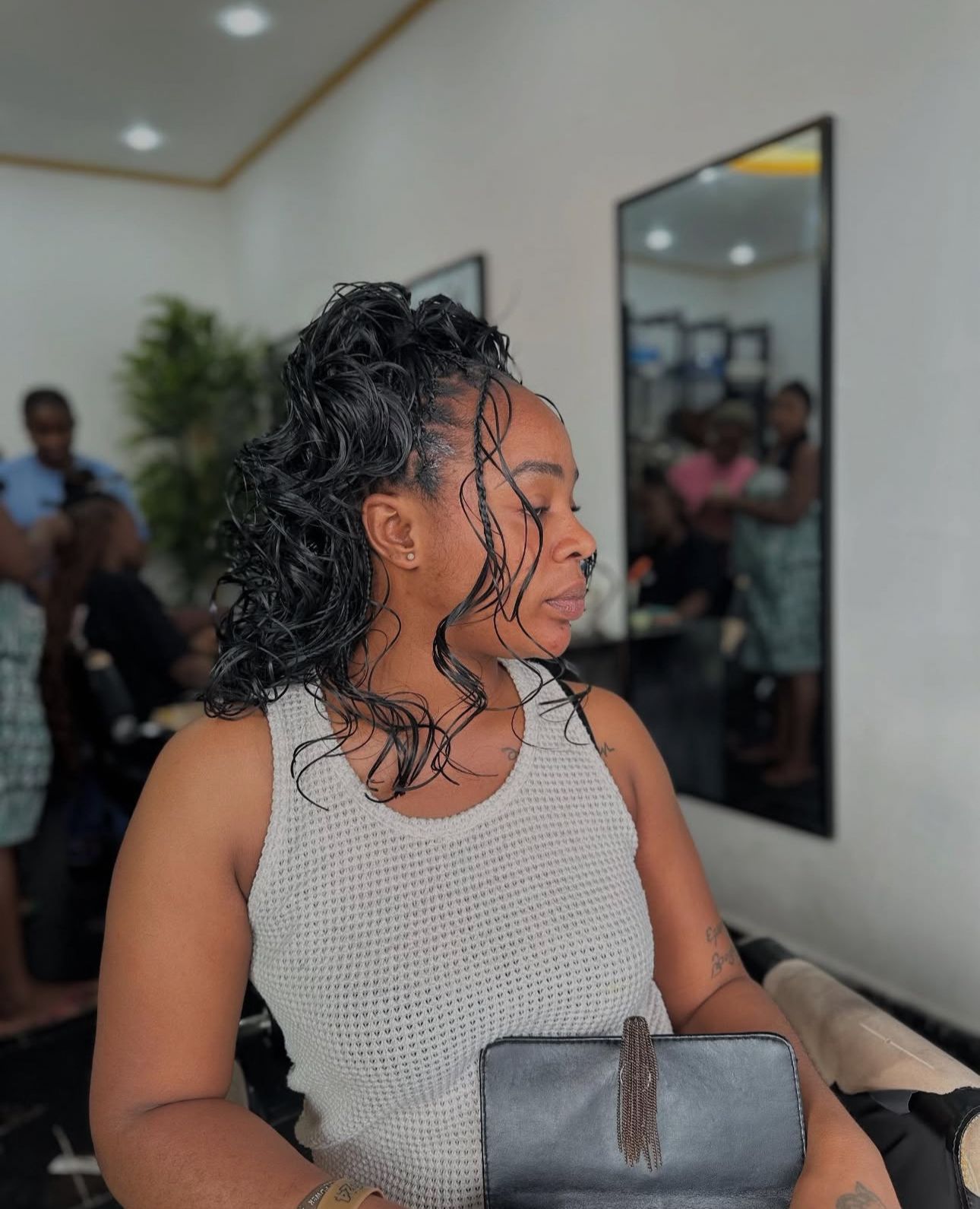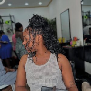 The French Curl Bob is a modern braided bob style created using pre-curled French curl hair. The top half of the hairstyle features sleek, knotless or box braids, while the ends are left curly and voluminous — falling around the chin, jawline, or just past the shoulders. The result is a soft, elegant look with natural bounce and a luxurious finish.